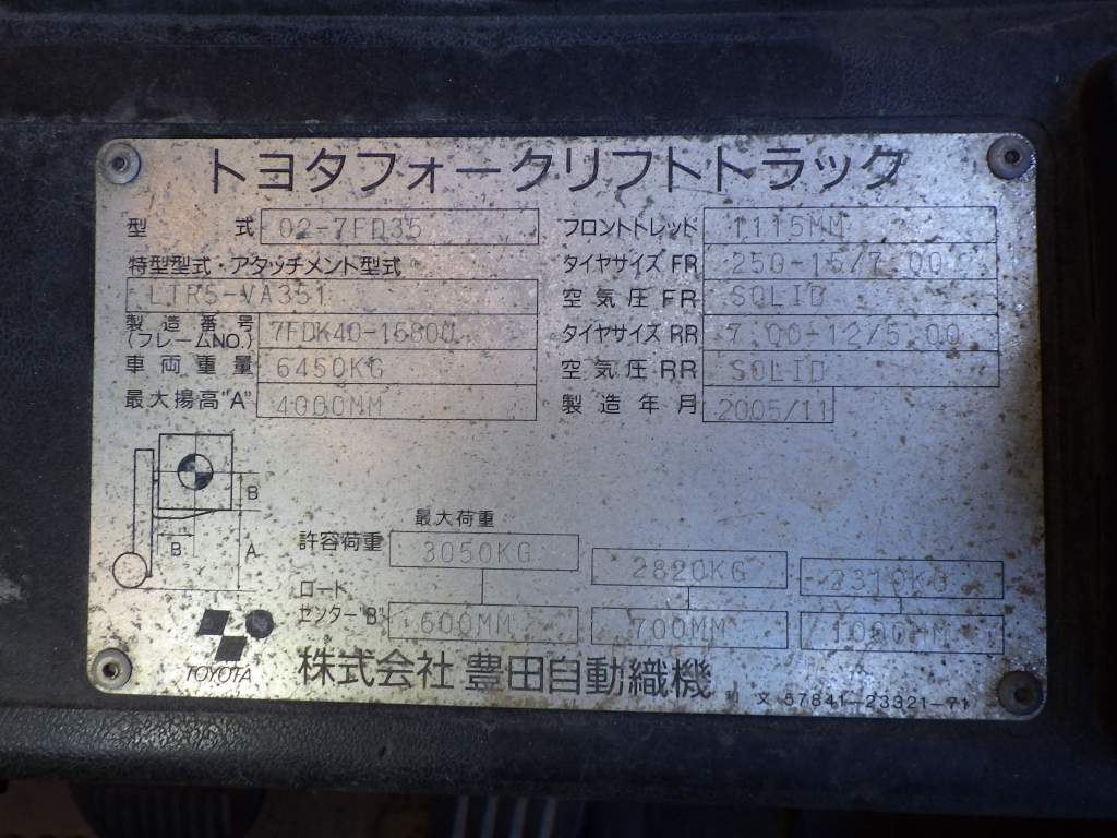 Thông số Xe nâng dầu 3,5 tấn TOYOTA 7FD35, dịch càng, tháp nâng cao 4m, sản xuất 2005