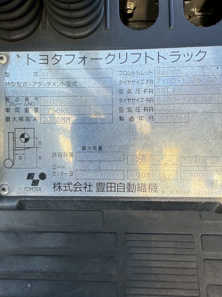 Xe nâng Nhật bãi 2,5 tấn TOYOTA 8FD25 số sàn, nâng cao 4 m, sản xuất năm 2012. Xe sử dụng động cơ 1DZ, là dòng động cơ kim phun cơ cực kỳ tiết kiệm nhiên liệu